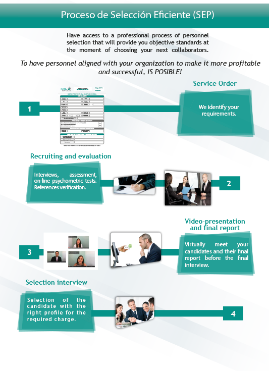 We identify, evaluate and verify the responsibilities, knowledge, experience and skills of the candidate, required by our customers, providing the ideal profile for your organization. In order to do this, we rely on tools that allow us to carry out an effective candidate assessment requested through the following stages:
